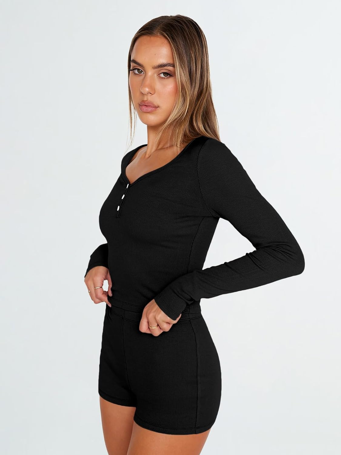 Trendy Queen Womens Two Piece Sets Lounge 2 Piece Outfits Ribbed Knit Shorts and Long Sleeve Button Down Top Tracksuit 2024Create a new description for this product from the title with 500 characters